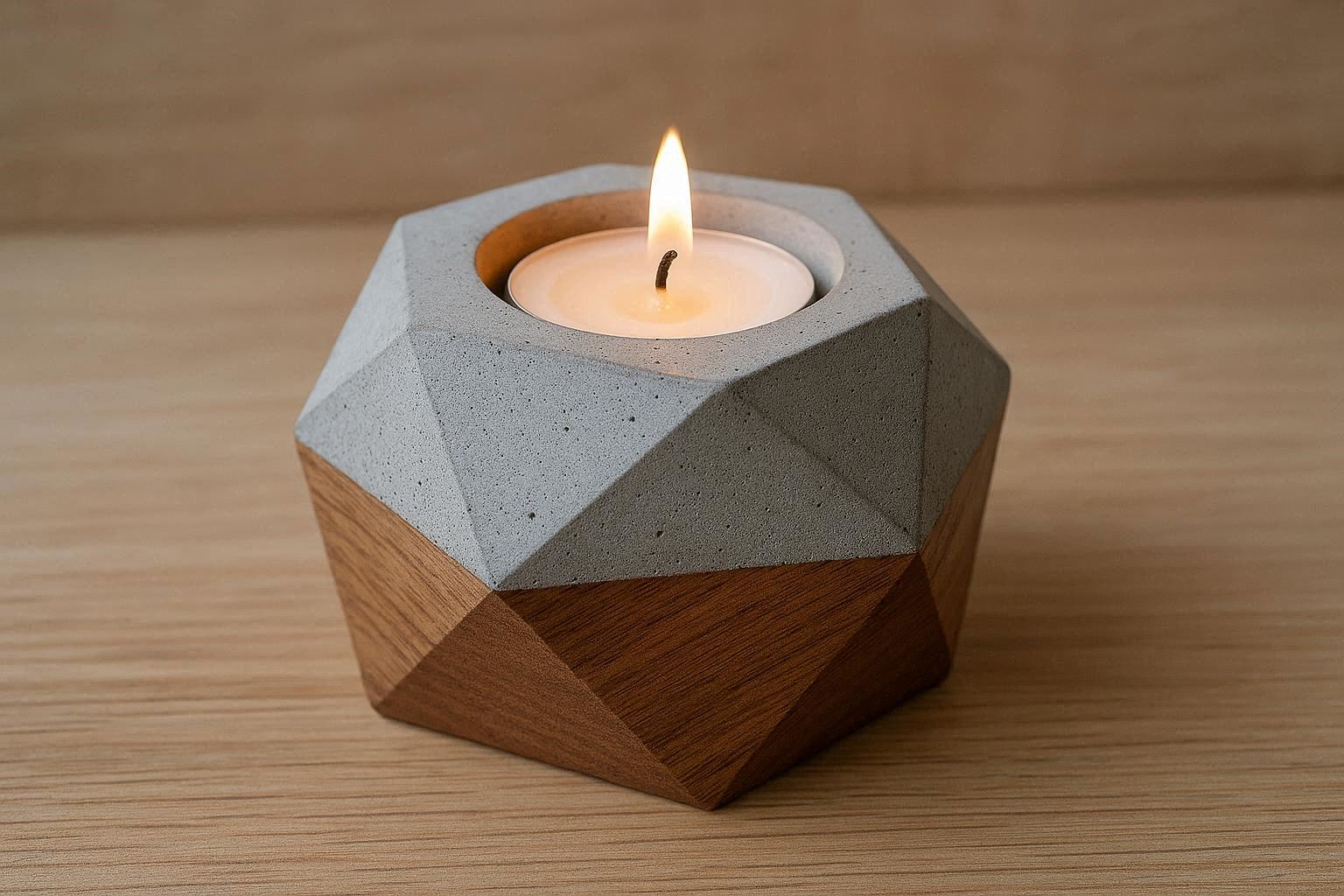 This modern candle holder combines the raw texture of concrete with the warm touch of natural wood for a striking contrast. The geometric concrete base features a circular indentation that securely holds a tea light, while the walnut wood accent adds organic warmth. Its minimalist design is both sturdy and sculptural, fitting seamlessly into contemporary, industrial, or Scandinavian interiors.